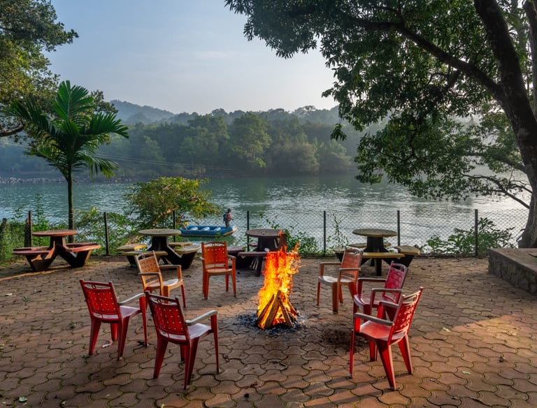 As night falls, guests gather around a crackling campfire at the resort. The bonfire creates a cozy atmosphere for sharing stories and laughter with loved ones, completing the jungle stay.