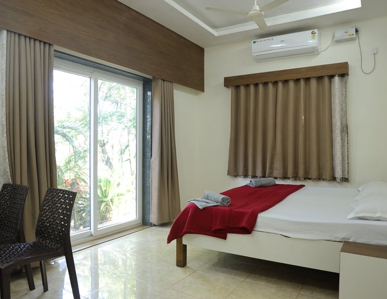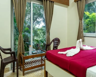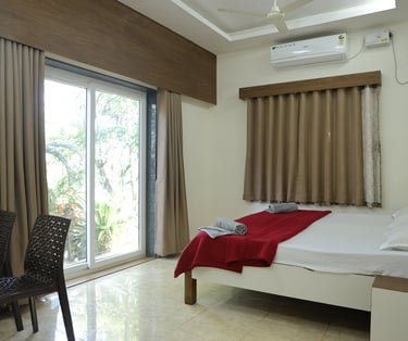 The Premium river couple view is designed for over 5 guests, featuring contemporary décor, plush furnishings, and modern amenities like high-speed internet and a work desk for relaxation and productivity.