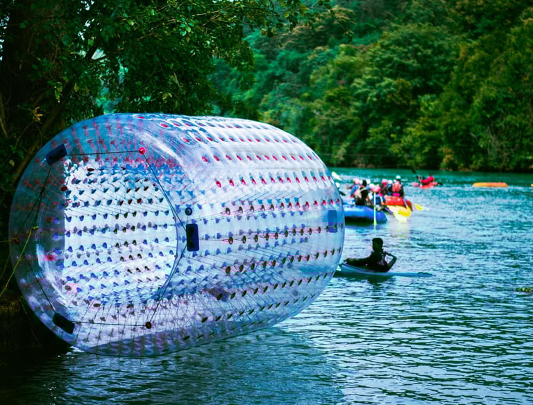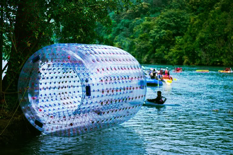 Zorbing is a fun activity where you enter a clear inflatable ball and roll across the Kali River's calm water.